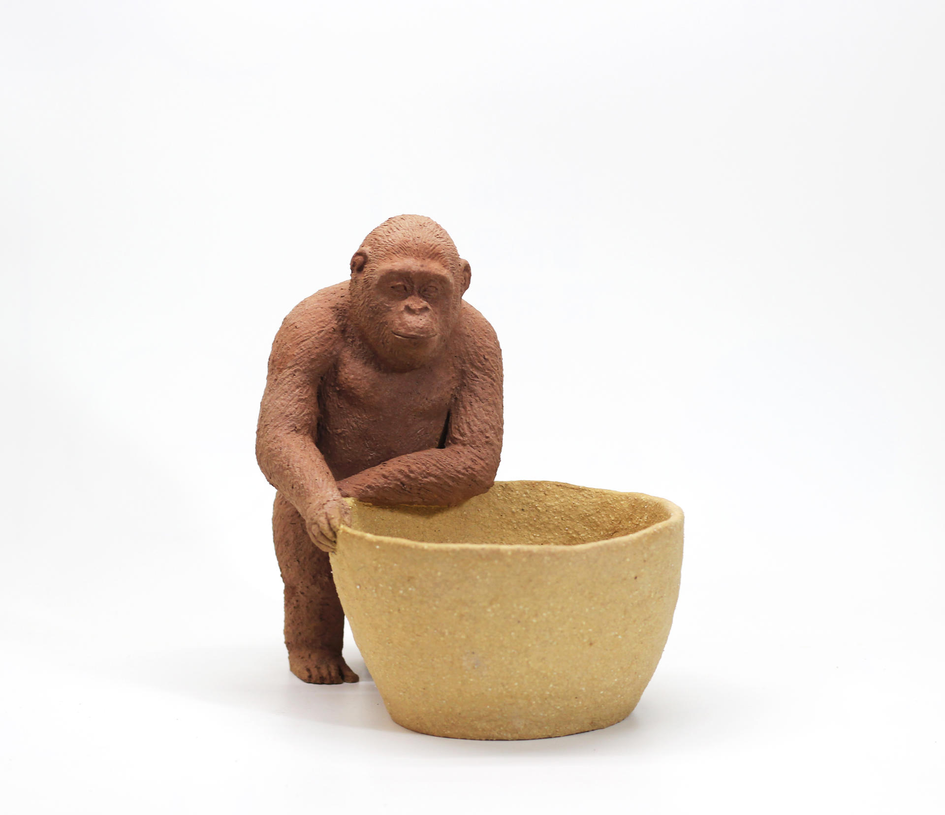 The artist has always dealt with clay as a sculptor, and this time, she grafted terra cotta molding and practical pottery. This series can be roughly divided into two groups. One is a group of animal-shaped vases, and the other of more serious pieces which Park has been working on portraying silverback lowland gorillas with a variety of intriguing poses.