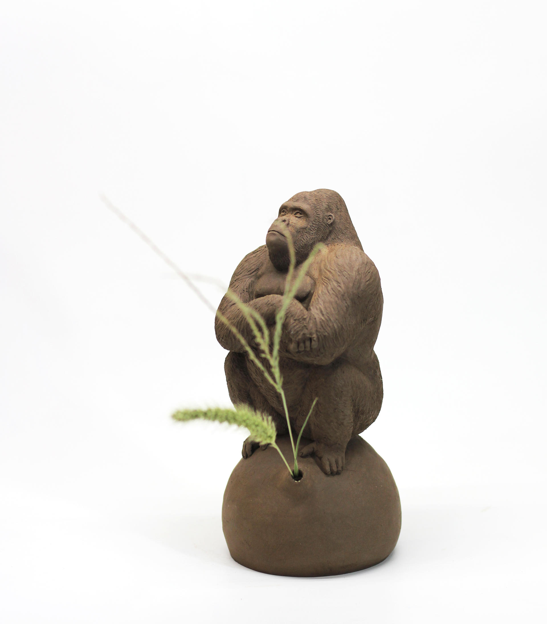 The artist has always dealt with clay as a sculptor, and this time, she grafted terra cotta molding and practical pottery. This series can be roughly divided into two groups. One is a group of animal-shaped vases, and the other of more serious pieces which Park has been working on portraying silverback lowland gorillas with a variety of intriguing poses.