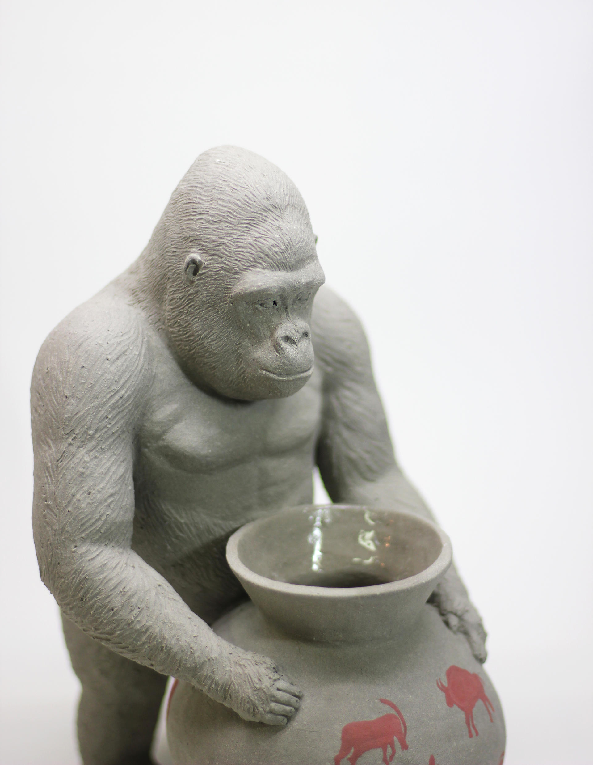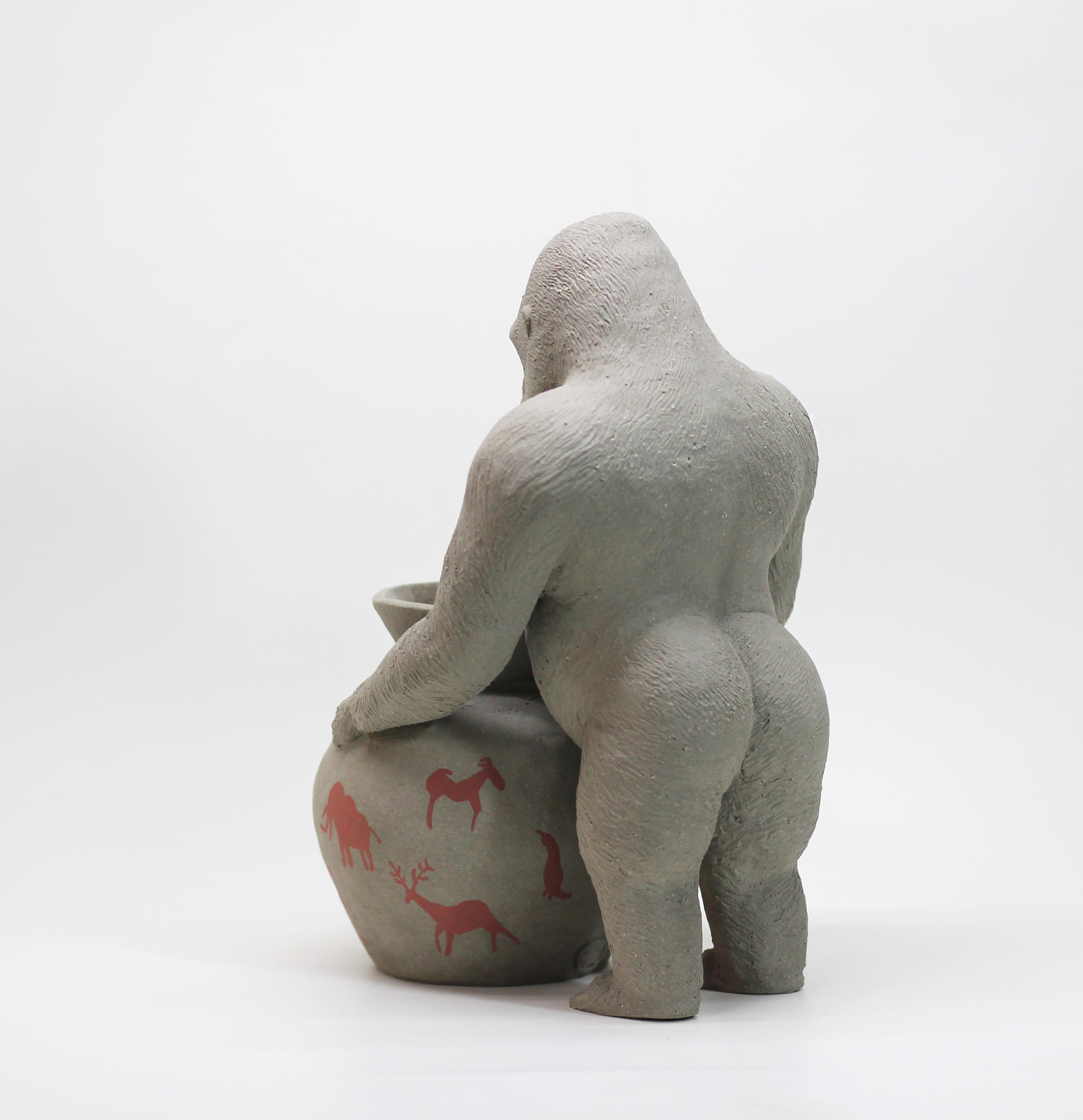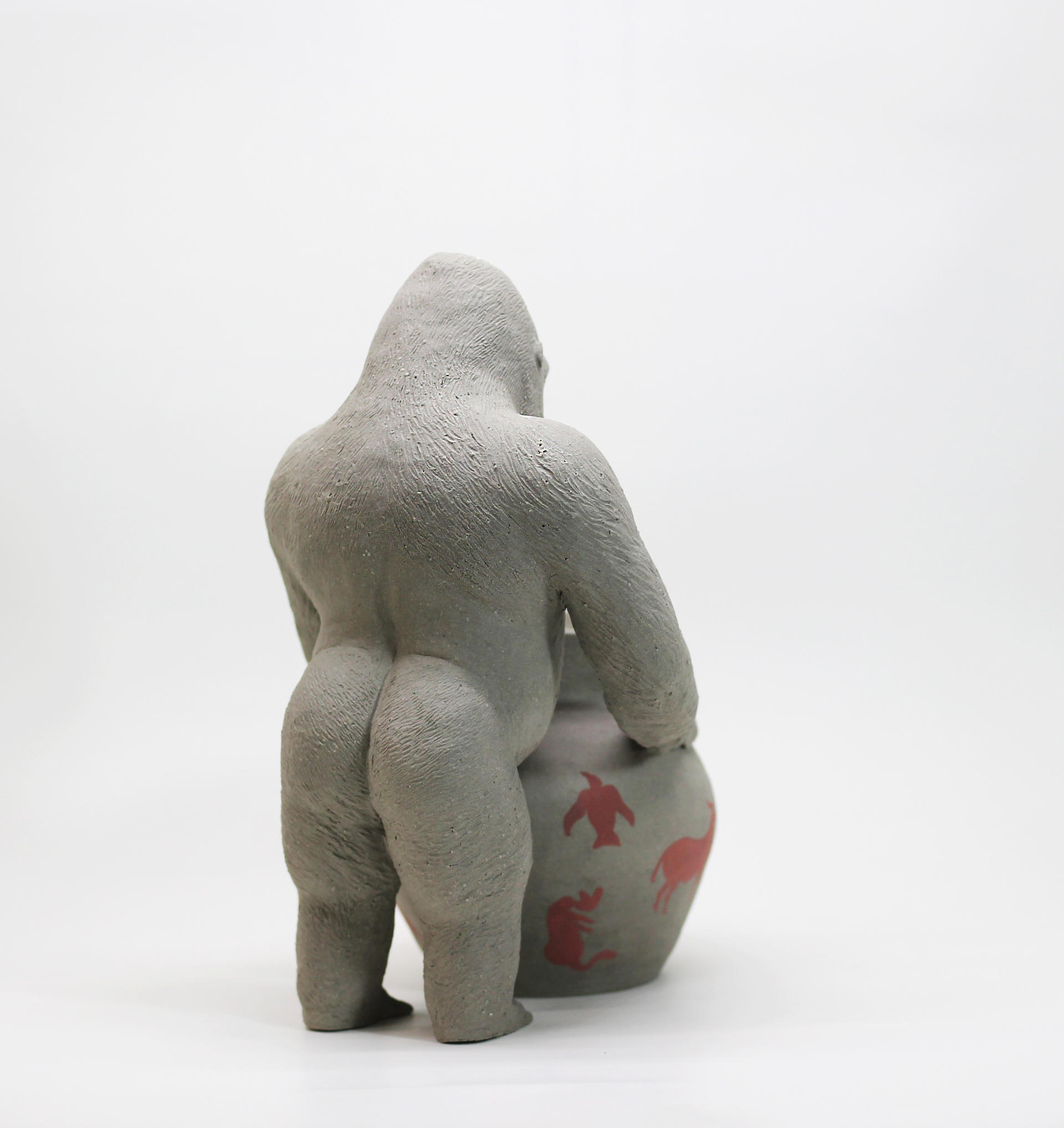 소조적 방식으로 표현된 사실적 고릴라 형상을 불에 구워 고정시키는 것은 까마득한 과거에 원초적 인류가 토우를 만들어내었던 그 행위와 맥을 같이한다.