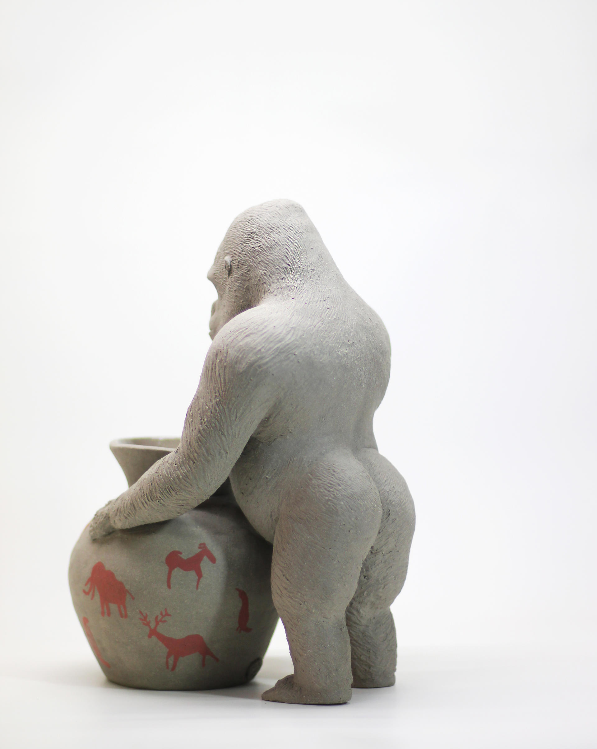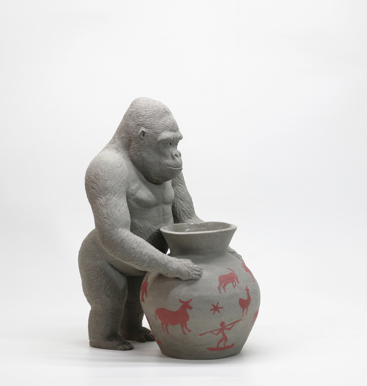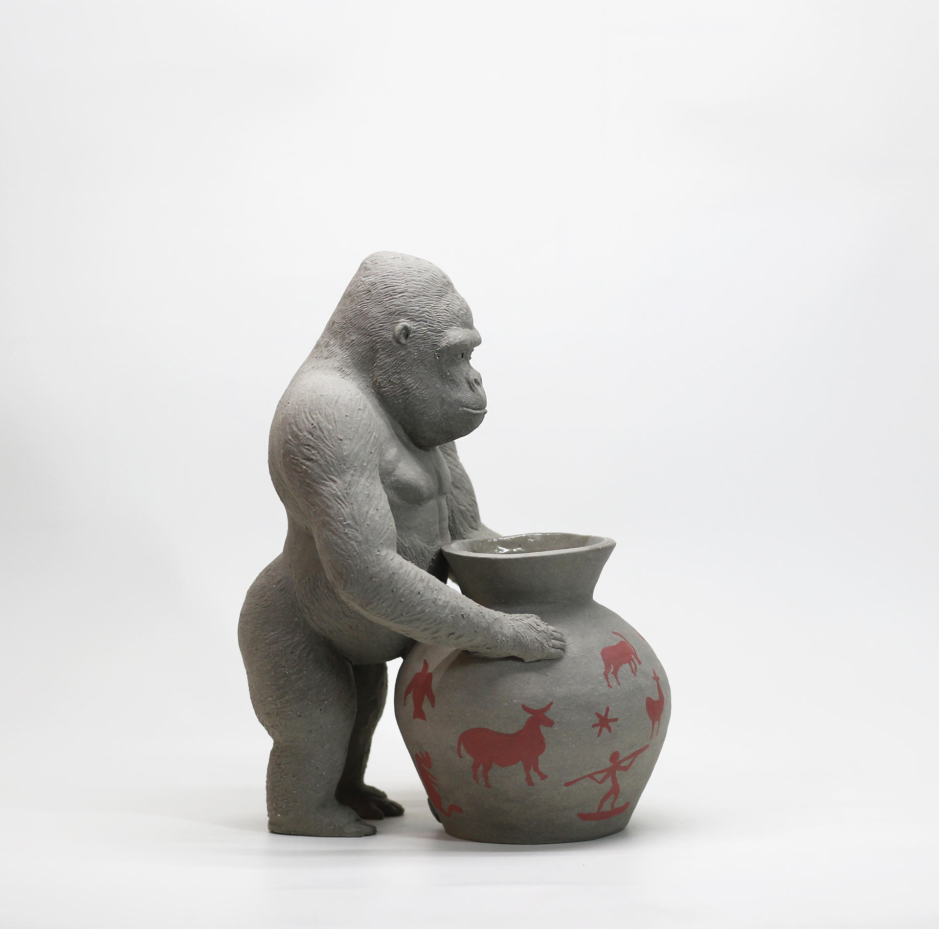 소조적 방식으로 표현된 사실적 고릴라 형상을 불에 구워 고정시키는 것은 까마득한 과거에 원초적 인류가 토우를 만들어내었던 그 행위와 맥을 같이한다.