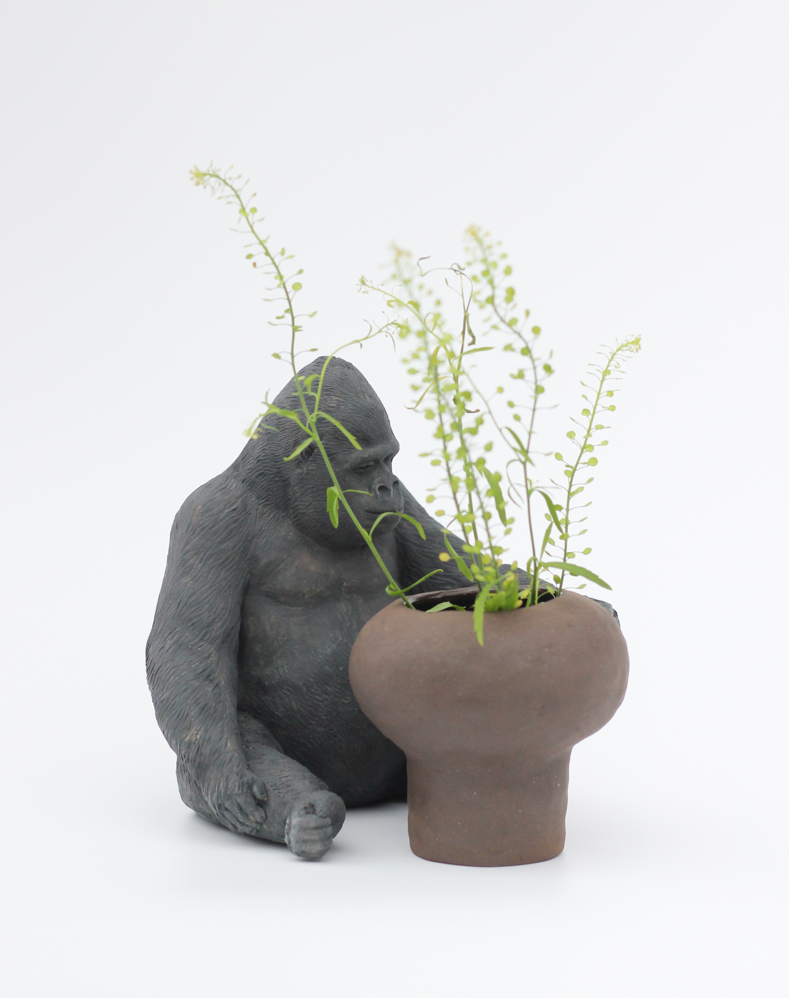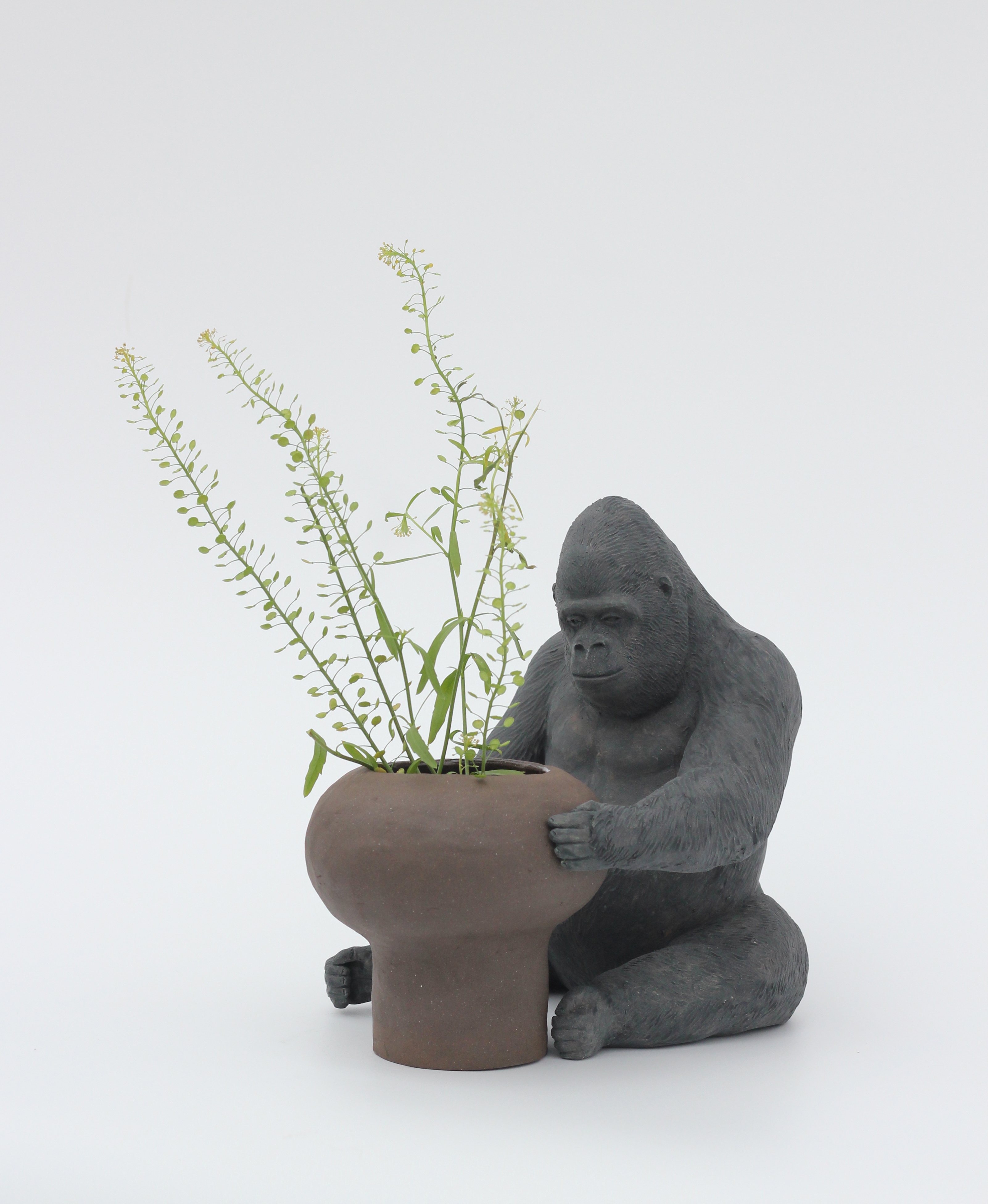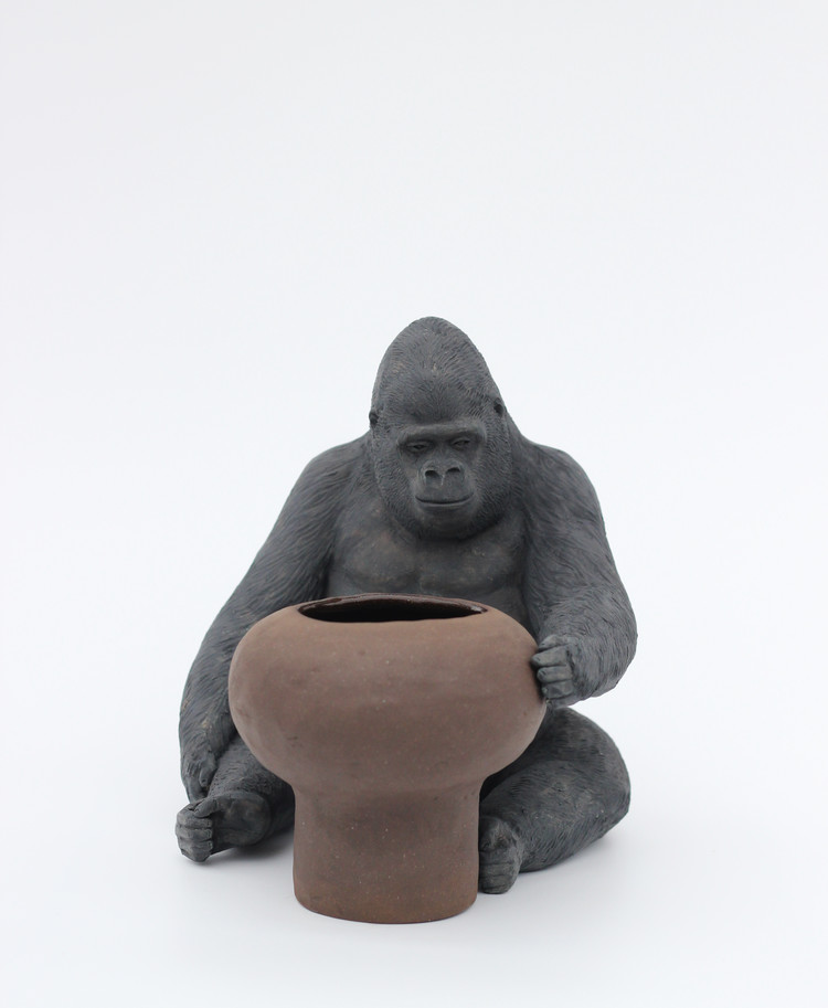 The artist has always dealt with clay as a sculptor, and this time, she grafted terra cotta molding and practical pottery. This series can be roughly divided into two groups. One is a group of animal-shaped vases, and the other of more serious pieces which Park has been working on portraying silverback lowland gorillas with a variety of intriguing poses.
